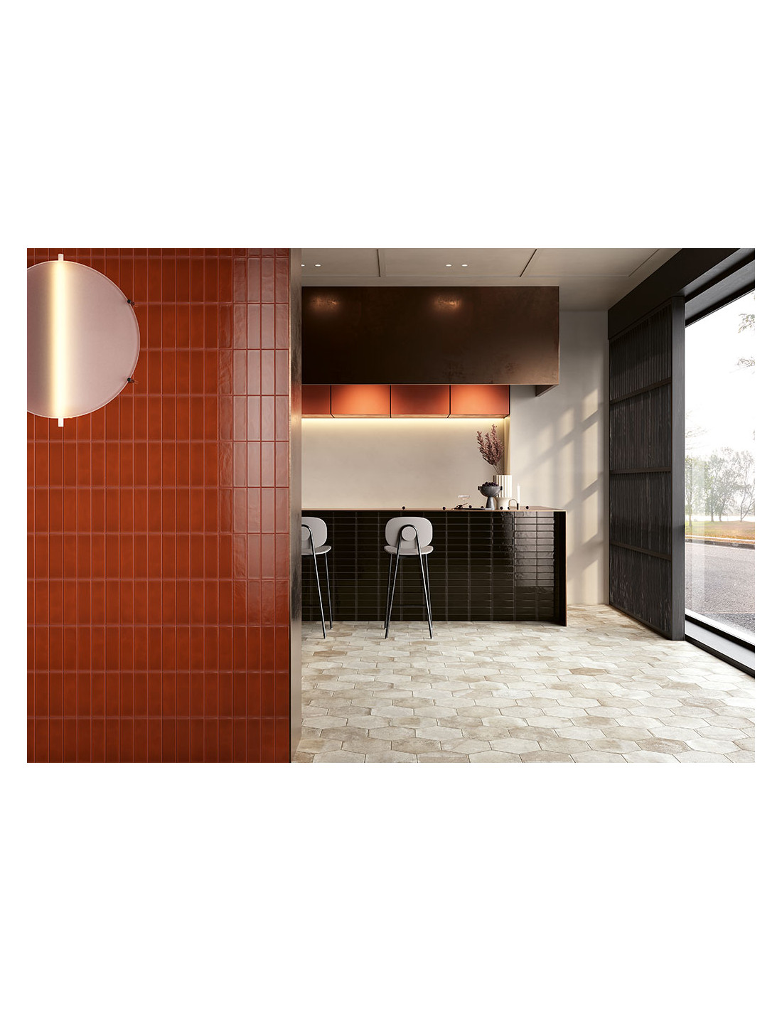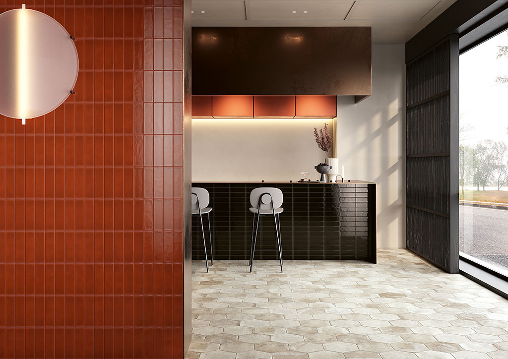Déclinée en quatre nuances – Avorio, Rosa, Cotto et Nero – et en formats variés, elle s’adapte avec harmonie aux espaces intérieurs et extérieurs. Les petits hexagones et briques complètent la gamme, tandis que les versions en maïolique brillante apportent une touche raffinée et lumineuse.