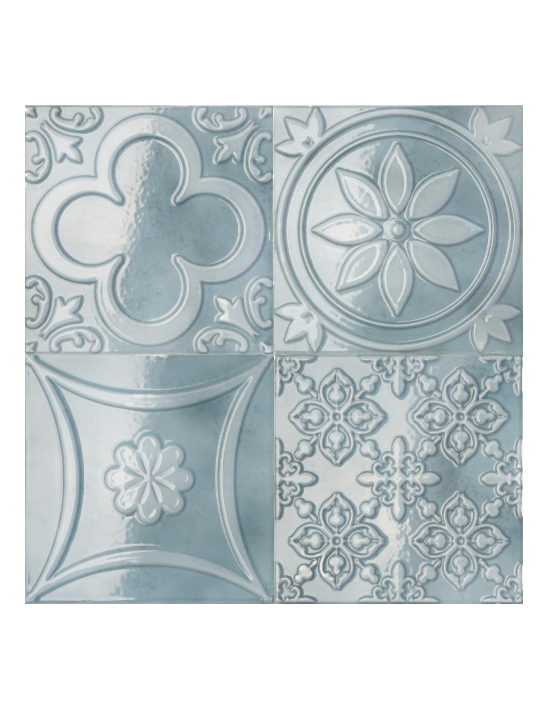 Les carreaux de la série LUCCIOLA proposent des jeux de quatre reliefs inspirés par des motifs traditionnels de carreaux de ciment.